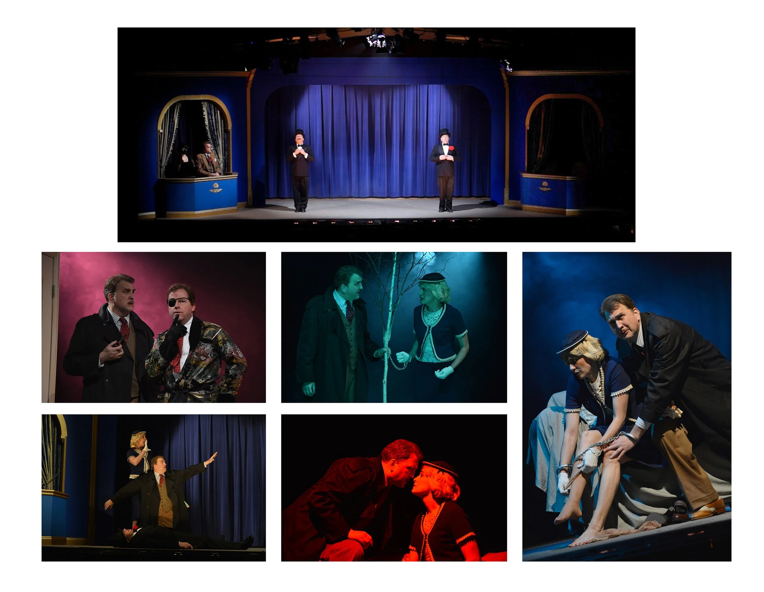 With The 39 Steps, we went the opposite direction: a creative, minimalist design that embraced the show’s speed and theatrical tricks. Co-directing while handling sets and props meant creating a flexible vocabulary—portable elements, multipurpose pieces, and prop choices that could instantly suggest a new location. Lighting and atmosphere did a lot of the heavy lifting on transitions, letting us whip from train to street to hotel to moorland in seconds, while the staging stayed clear and the comedy never lost momentum.